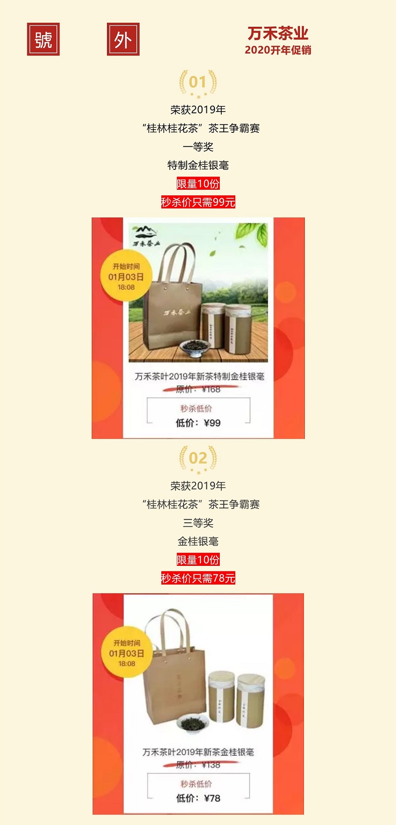 2019年12月5日,在廣西第二屆“桂林桂花茶”發(fā)展峰會(huì)上,廣西萬禾茶業(yè)的“萬禾幽香一號(hào)(特制金桂銀毫)”“萬禾幽香二號(hào)(金桂銀毫)”兩款桂花茶,榮獲桂林市第二屆“桂林桂花茶”茶王爭(zhēng)霸賽的一等獎(jiǎng)和三等獎(jiǎng)。