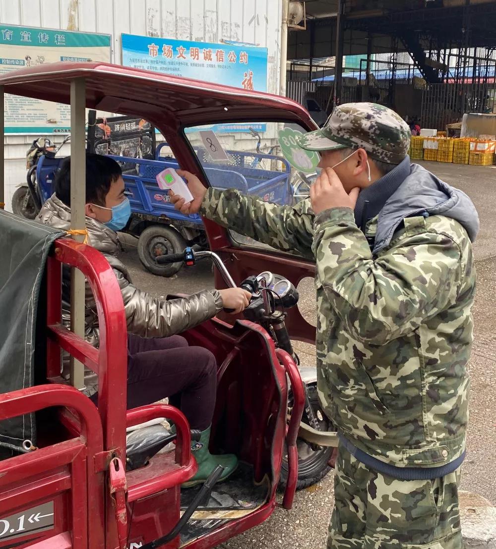 為實(shí)現(xiàn)“防輸入、防蔓延、防輸出”的疫情防控目標(biāo),萬禾公司、五里店市場從堵住源頭入手,對進(jìn)出市場的每臺車輛進(jìn)行仔細(xì)消毒,加強(qiáng)車輛出入管理,暫時限制疫區(qū)往來人員進(jìn)入市場。在市場的每個入口安排工作人員使用測溫儀對進(jìn)入市場人員檢測體溫,同時檢查其口罩佩戴情況,如有未佩戴口罩的,禁止其進(jìn)入市場;已進(jìn)入市場內(nèi)部的,進(jìn)行勸說,不聽勸說者,將其請離市場。