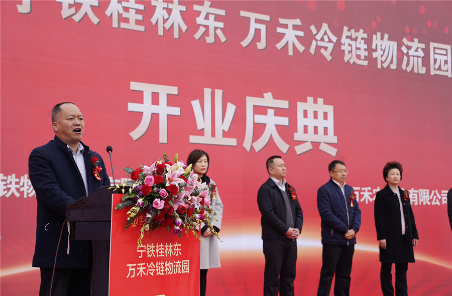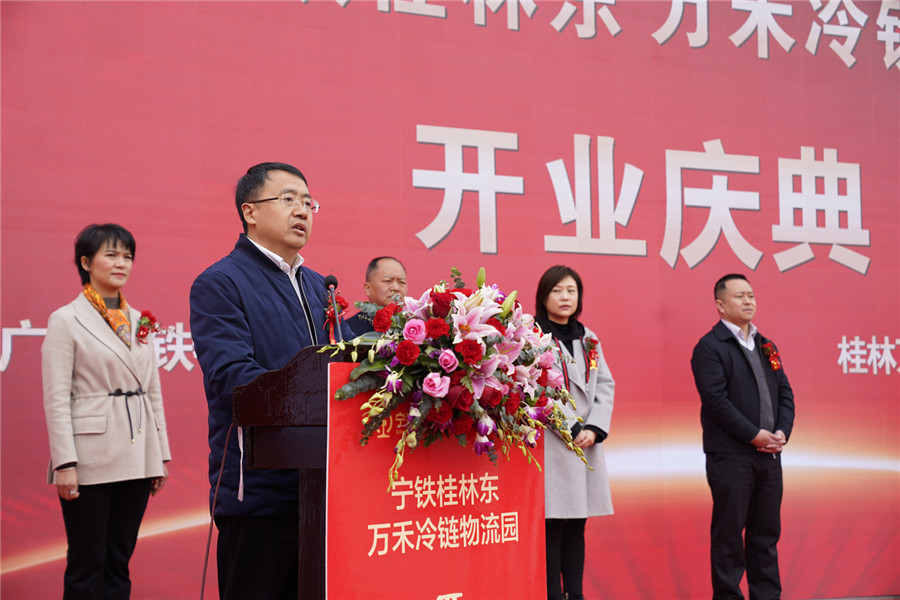 開業(yè)慶典上,中國鐵路南寧局集團(tuán)有限公司總會計師趙山發(fā)表致辭:“廣西寧鐵物資工業(yè)有限公司是中國鐵路南寧局集團(tuán)有限公司的全資子公司,承擔(dān)著中國鐵路南寧局集團(tuán)有限公司與地方政府共同開發(fā)鐵路資源的重任,是桂林西鐵路物流園,柳州鐵路港主要建運單位,為促進(jìn)區(qū)域經(jīng)濟(jì)發(fā)展作出積極貢獻(xiàn)。寧鐵桂林東萬禾冷鏈物流園由桂林萬禾農(nóng)產(chǎn)品有限公司與廣西寧鐵物資工業(yè)有限公司合作投入巨資共同開發(fā)建設(shè),實現(xiàn)了農(nóng)產(chǎn)品、冷鏈、倉儲、物流、檢測、交易、服務(wù)咨詢于一體,該項目的建設(shè)開業(yè),合作雙方發(fā)揮了各自優(yōu)勢,實現(xiàn)了強(qiáng)強(qiáng)聯(lián)合,達(dá)到了預(yù)期的效果,是各級企業(yè)與地方政府合作的典范,希望合作雙方繼續(xù)加強(qiáng)溝通與合作,共同打響寧鐵桂林東萬禾冷鏈物流園的品牌,共同打造全渠道冷鏈物流典型產(chǎn)業(yè)園。"