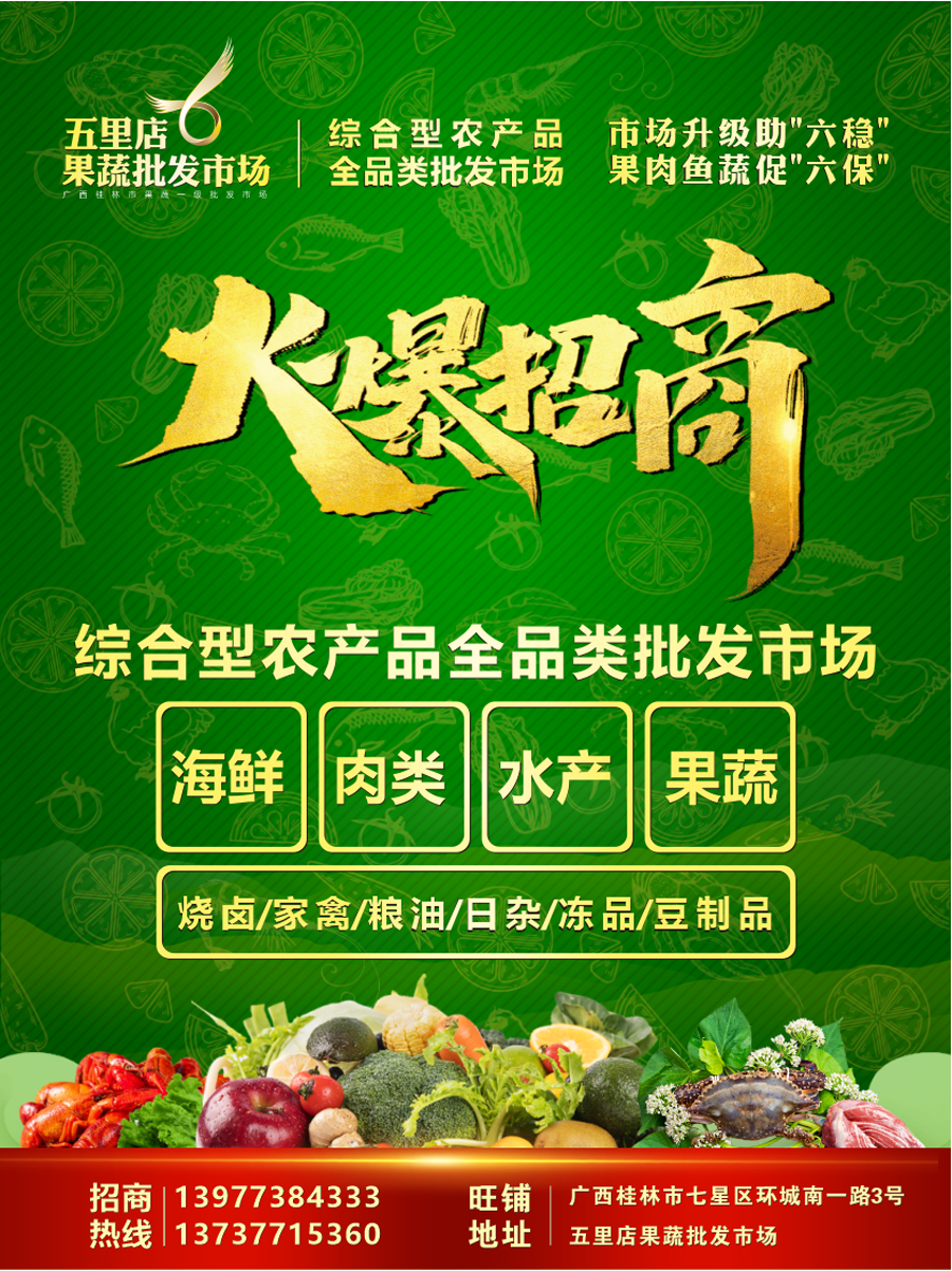 桂林五里店綜合農(nóng)產(chǎn)品批發(fā)市場目前開放果蔬區(qū)、海鮮區(qū)、水產(chǎn)區(qū)、肉類區(qū)、燒鹵區(qū)、家禽區(qū)、日雜區(qū)、凍品區(qū)、豆制品區(qū)、糧油區(qū)10個(gè)業(yè)態(tài)批發(fā)類招商。