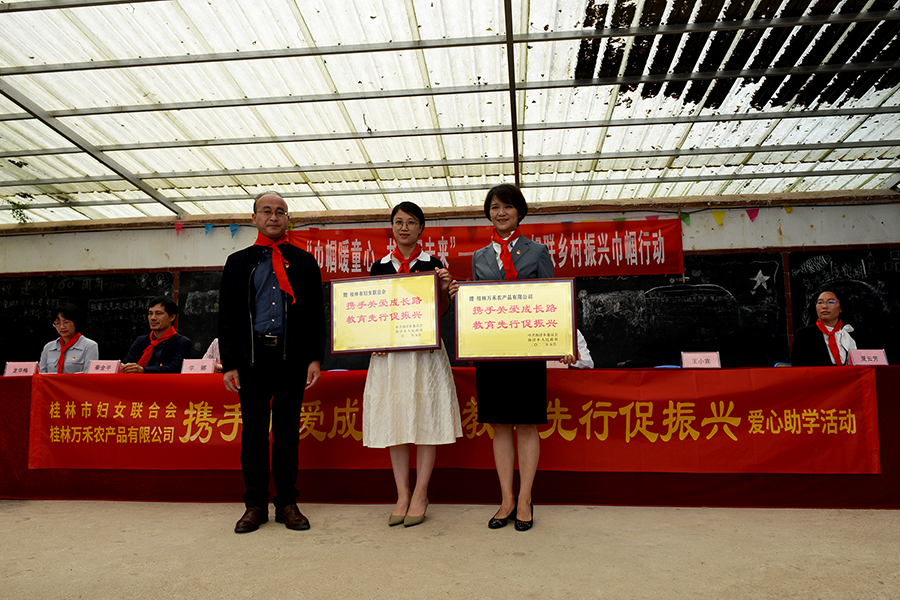 桂林市婦聯(lián)執(zhí)委常委、萬禾集團(tuán)黨總支書記、總經(jīng)理崔萌佳作為愛心企業(yè)代表發(fā)言,她表示,為深入貫徹落實(shí)鄉(xiāng)村振興戰(zhàn)略,萬禾集團(tuán)在企業(yè)發(fā)展過程中,一直與海洋鄉(xiāng)有著緊密的聯(lián)系,萬禾的發(fā)展之路更得益于鄉(xiāng)村振興戰(zhàn)略的實(shí)施,從單一的農(nóng)產(chǎn)品銷售平臺(tái)成長為農(nóng)業(yè)及農(nóng)產(chǎn)品流通產(chǎn)業(yè)發(fā)展的公司,對(duì)助力鄉(xiāng)村振興更有著義不容辭的責(zé)任。萬禾集團(tuán)將以“促進(jìn)振興鄉(xiāng)村教育和教育振興鄉(xiāng)村的良性循環(huán)”為紐帶,持續(xù)關(guān)注著海洋鄉(xiāng)各村屯產(chǎn)業(yè)興旺發(fā)展、生態(tài)文明建設(shè)、農(nóng)民生產(chǎn)生活狀況。