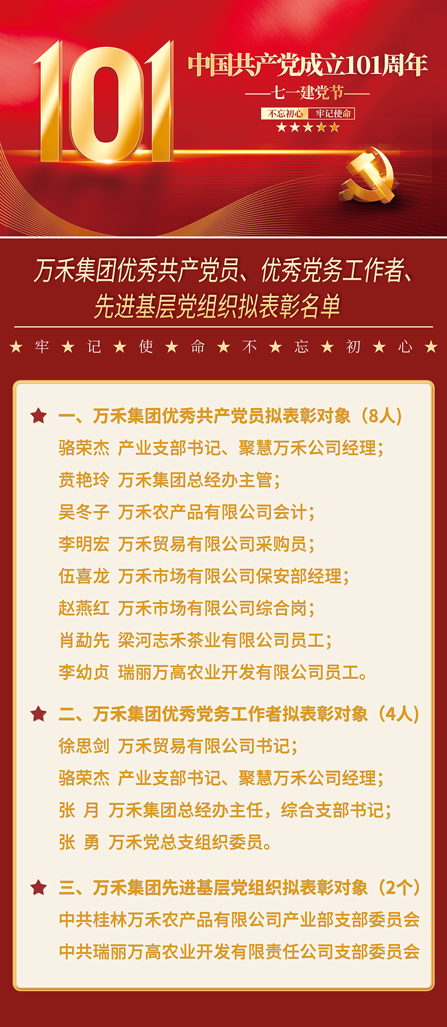 今年是中國共產黨成立101周年。黨總支決定,表彰一批公司優(yōu)秀共產黨員、優(yōu)秀黨務工作者和先進基層黨組織。根據(jù)評選表彰工作部署,在公司各支部提出推薦對象的基礎上,經認真審核、遴選審議,確定了駱榮杰等8名同志為公司優(yōu)秀共產黨員、徐思劍等4名同志為公司優(yōu)秀黨務工作者、中共桂林萬禾農產品有限公司產業(yè)部支部委員會2個基層黨組織為公司先進基層黨組織擬表彰對象。