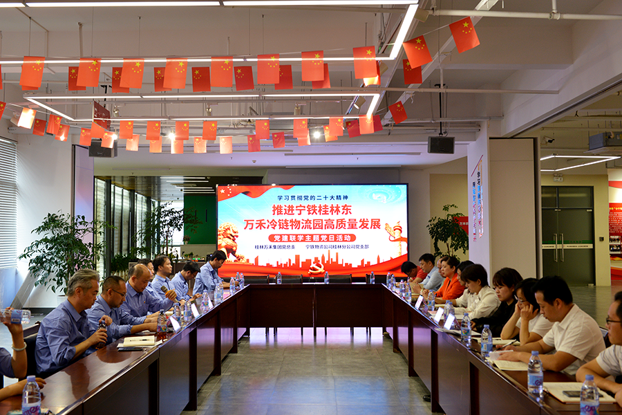 為深入學(xué)習(xí)貫徹落實(shí)黨的二十大會議精神,加強(qiáng)廣西寧鐵物資工業(yè)有限公司桂林分公司、萬禾集團(tuán)間的溝通和交流,推進(jìn)寧鐵桂林東萬禾冷鏈物流園高質(zhì)量發(fā)展。11月11日下午,萬禾集團(tuán)黨總支和廣西寧鐵物資工業(yè)有限公司桂林分公司黨支部在萬禾集團(tuán)黨建活動中心開展“學(xué)習(xí)二十大,推進(jìn)寧鐵桂林東萬禾冷鏈物流園高質(zhì)量發(fā)展”黨建聯(lián)學(xué)主題黨日活動。
