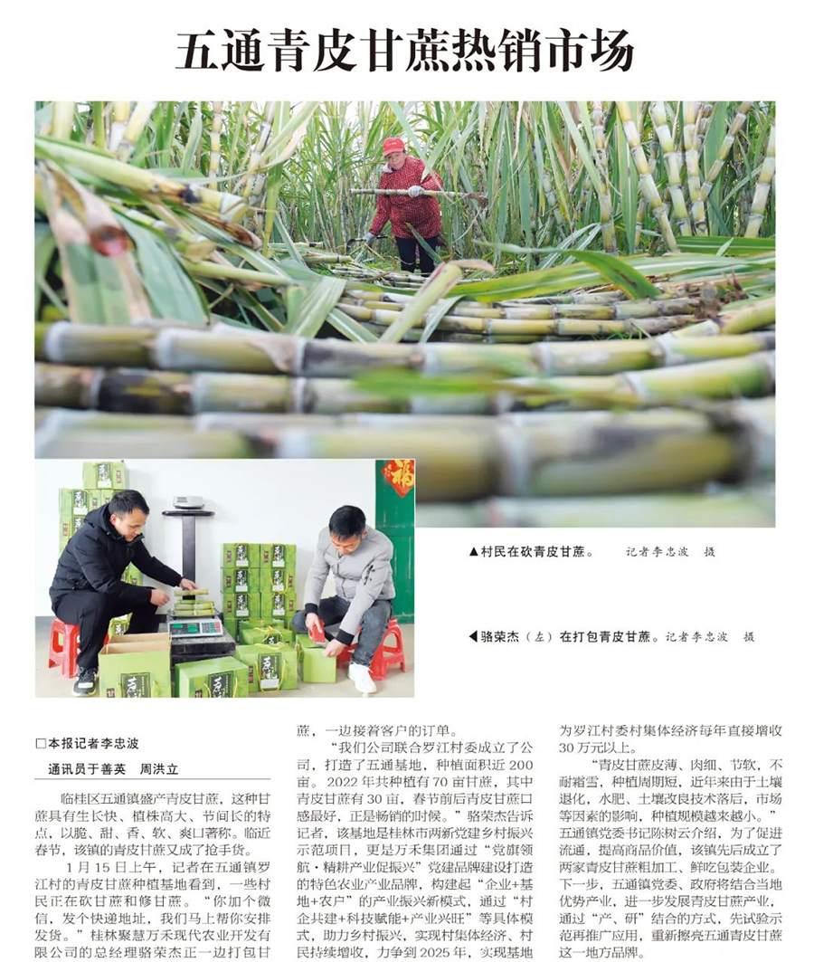 “我們公司聯(lián)合羅江村委成立了公司,打造了五通基地,種植面積近200畝。2022年共種植有70畝甘蔗,其中青皮甘蔗有30畝,春節(jié)前后青皮甘蔗口感最好,正是暢銷的時(shí)候?!瘪槝s杰告訴記者,該基地是桂林市兩新黨建鄉(xiāng)村振興示范項(xiàng)目,更是萬(wàn)禾集團(tuán)通過“黨旗領(lǐng)航·精耕產(chǎn)業(yè)促振興”黨建品牌建設(shè)打造的特色農(nóng)業(yè)產(chǎn)業(yè)品牌,構(gòu)建起“企業(yè)+基地+農(nóng)戶”的產(chǎn)業(yè)振興新模式,通過“村企共建+科技賦能+產(chǎn)業(yè)興旺”等具體模式,助力鄉(xiāng)村振興,實(shí)現(xiàn)村集體經(jīng)濟(jì)、村民持續(xù)增收,力爭(zhēng)到2025年,實(shí)現(xiàn)基地為羅江村委村集體經(jīng)濟(jì)每年直接增收30萬(wàn)元以上。
