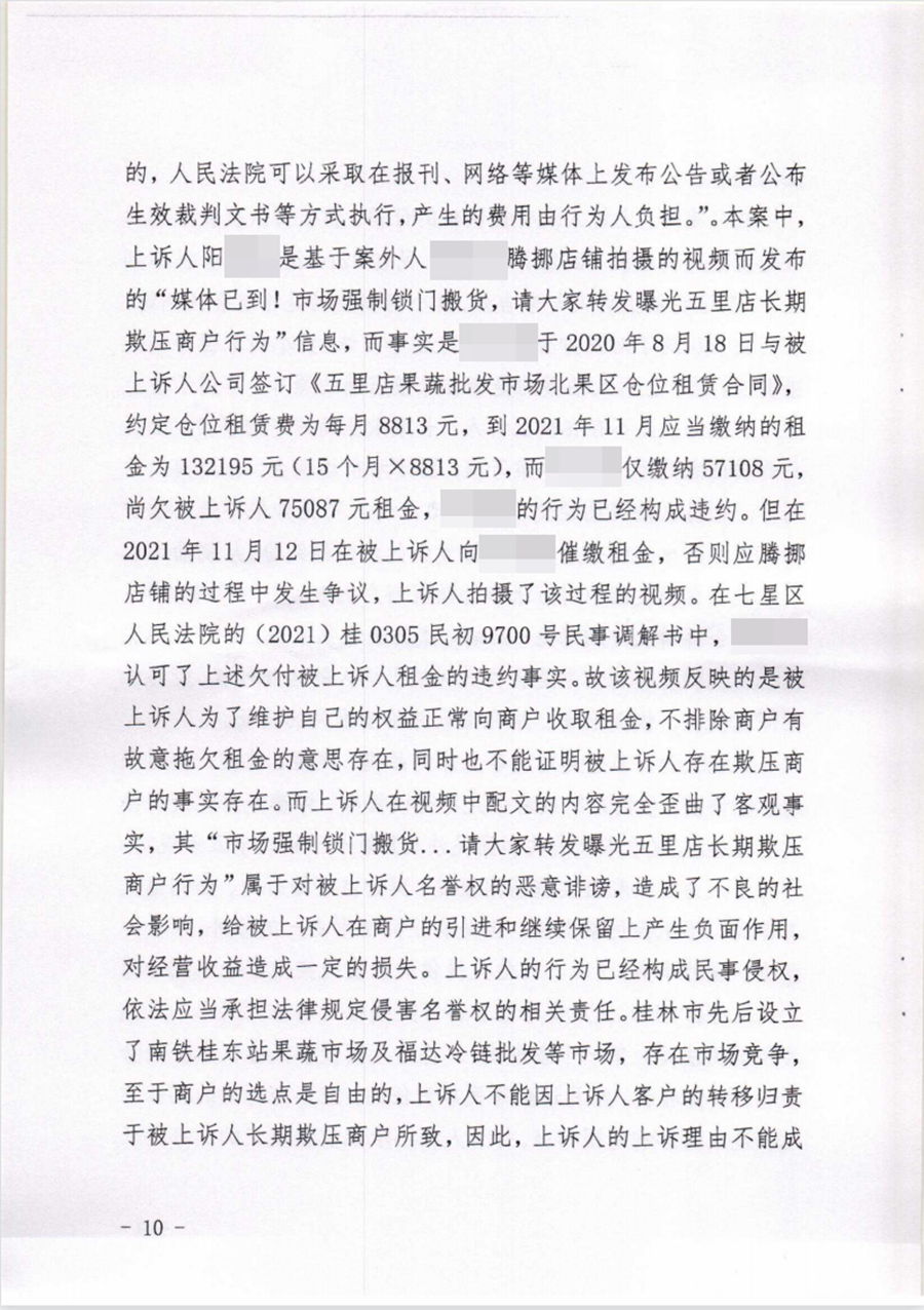 2022年11月28日,桂林萬(wàn)禾市場(chǎng)管理有限責(zé)任公司(以下簡(jiǎn)稱:萬(wàn)禾市場(chǎng)公司)與陽(yáng)某某名譽(yù)權(quán)糾紛案件作出二審判決,駁回陽(yáng)某某上訴,維持一審原判,陽(yáng)某某向萬(wàn)禾市場(chǎng)公司賠償損失、賠禮道歉,以消除影響,恢復(fù)名譽(yù)。