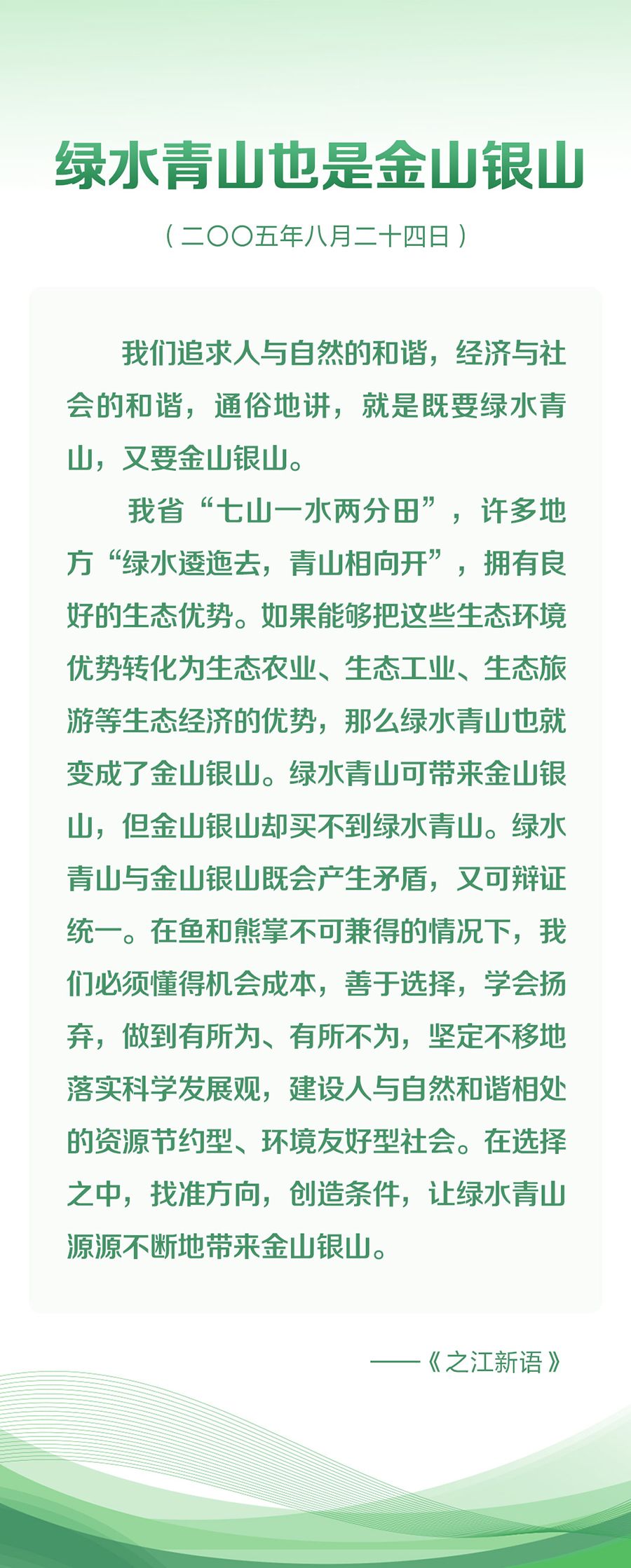 考察結(jié)束后,習(xí)近平在浙江日?qǐng)?bào)《之江新語》專欄發(fā)表了《綠水青山也是金山銀山》一文。