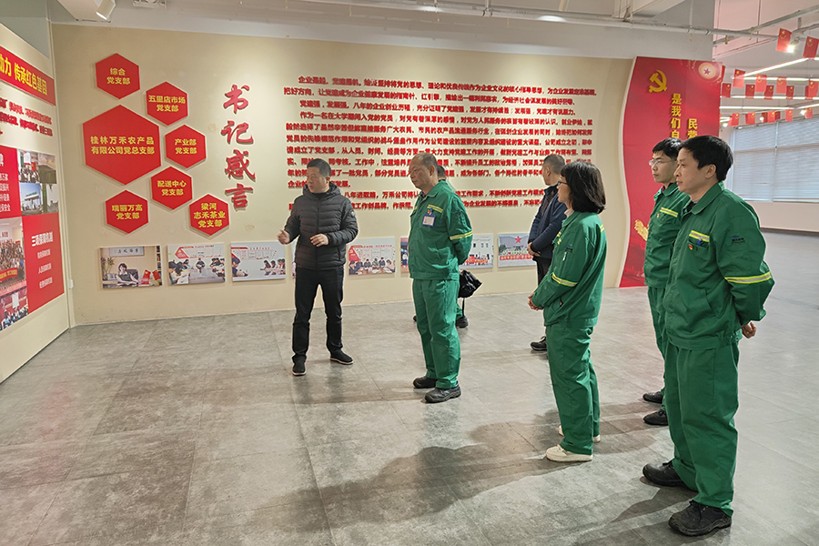 劉小榮書記一行首先來到萬禾集團黨建活動基地參觀學(xué)習,詳細了解萬禾集團的基本情況及通過黨建引領(lǐng)萬禾集團高質(zhì)量發(fā)展的歷程。在交流學(xué)習中,大家暢所欲言,就如何推動企業(yè)黨組織建設(shè)和發(fā)揮黨員先鋒模范作用交流經(jīng)驗做法,共為企業(yè)黨建發(fā)展出謀劃策。隨后,劉小榮書記一行來到會議室詳細查看了萬禾集團黨總支黨建臺賬和三會一課會議記錄,與大家深入探討如何更好地發(fā)揮黨組織的戰(zhàn)斗堡壘作用,進一步提升企業(yè)黨員隊伍的素質(zhì)和能力。